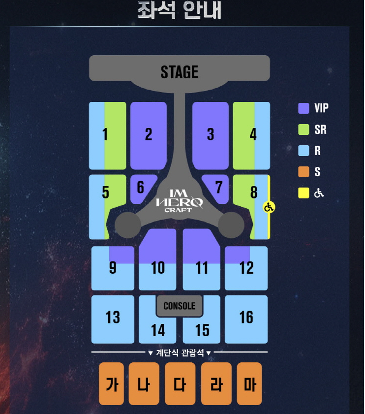 좌석은 보시는 바와 같이 예매 가능하시며, 스테이지와 가장 가까운 것은 1-12까지입니다. 돌출 스테이지로 충분히 히어로님을 느끼실 수 있는 기회가 되기를 바랍니다.