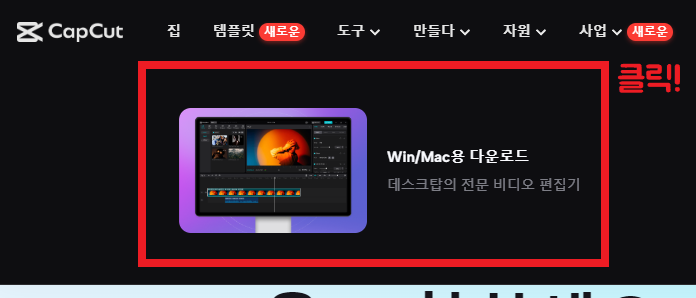캡컷은 윈도우와 맥용 다운로드, 그리고 모바일용 다운로드가 다릅니다. 왼쪽의 win/Mac용 다운로드를 클릭합니다.