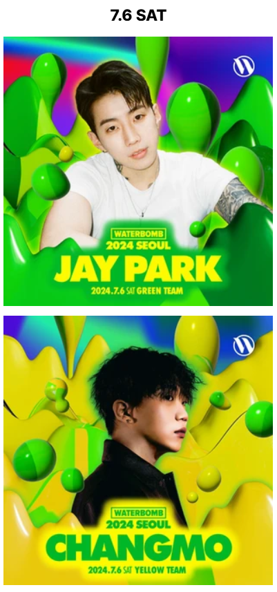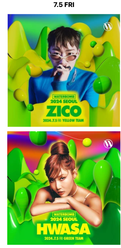불금인 7월 5일에는 지코와 화사가 출격합니다! 무대를 진정 즐길 줄 아는 가수들인데요. 지코는 이번에 신곡까지 나와서 더 다양한 무대를 선보여줄 것 같습니다! 무대위의 포식자 화사의 무대도 기대됩니다! 아마 워터밤의 불금을 시원하게 날려버릴 라인업이 될 것 같습니다!