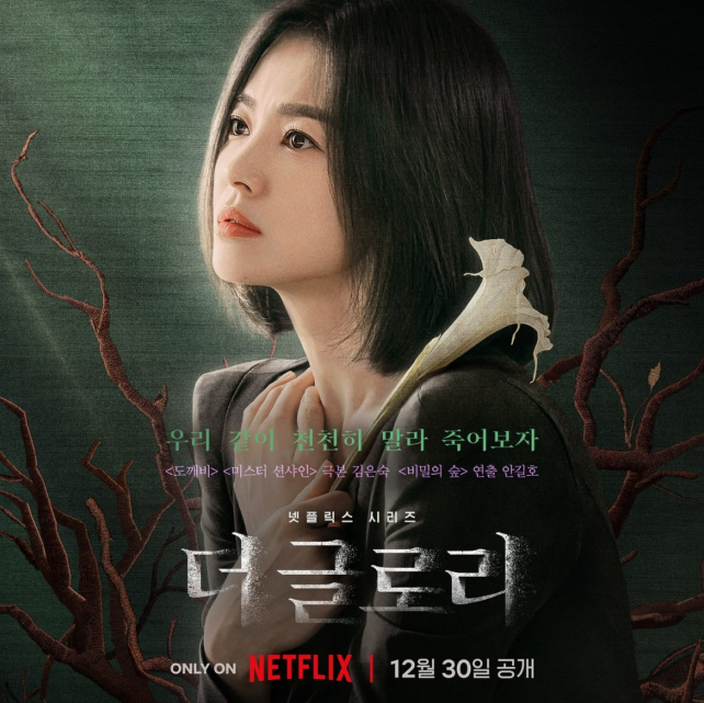 더글로리의 포스터에는 극중에 나왔던 악마의 나팔꽃을 들고 있는 송혜교의 모습이 나온다.