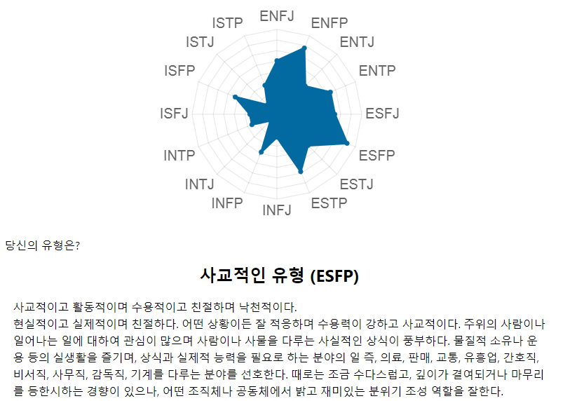 저는 아닐거라 생각했는데, 두번 다 ESFP가 나왔네요.