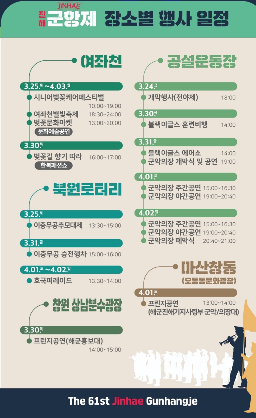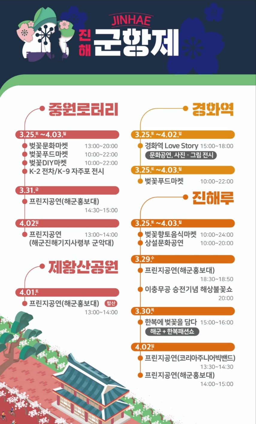 본격적으로 진해군항제가 시작되는 25일부터는 엄청나게 사람이 붐비기 때문에, 이보다 한 발 앞서 전야제를 구경하고 싶으신 분들이 많을 것 같은데요. 그런분들을 위해 전야제 행사일정부터 공개하도록 하겠습니다.