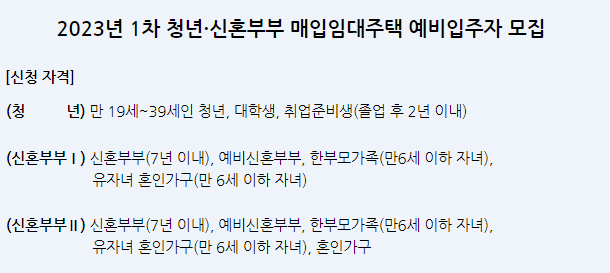 청년의 경우에는 만 19세~ 39세인 청년이면 지원가능하고, 신혼부부도 혼인신고 후 7년이내이면 신청가능합니다. 신혼부부 II의 경우는 전세형이므로, 이 점 참고하시기 바랍니다.