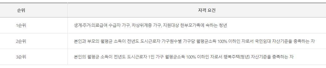 소득조건의 경우에는 무주택자여야 하고, 부모와 함께 살 경우에도 무주택자여야 합니다. 그리고 자산이 2순위에 경우 2억9200만원 이하, 3순위에 경우에는 2억 5400만원 이하여야 한다고 합니다. 자동차의 경우에도 제한이 있으니 위의 표를 참고하시기 바랍니다.