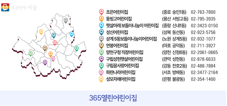 365 열린 어린이집에서는 긴급보육이 필요한 6개월~ 만 6세 아기를 대상으로 하고 있으며, 365일 24시간 보육 및 식사를 제공합니다. 오전 7시 반에서 밤 12시 또는 익일 7시 반까지 , 즉 한번 이용하실 때 최소 3시간에서 최대 24시간 이용 가능합니다. 24시간 연속으로 이용 시에는 최대 5일까지도 이용 가능합니다. 1시간당 3,000원, 1일 5만원의 비용이 있습니다. 식대는 별도로 1식 2,000원입니다. 1.1일 설명절, 추석연휴, 12.25일을 제외한 모든 날에 운영하고 있으니, 긴급하게 돌봄이 필요하신 분들은 365 열린 어린이집에 아이를 맡기실 수 있습니다. 현재 11개의 365 열린 어린이집이 운영되고 있는데요. 아래 이미지를 통해 확인하실 수 있습니다. 가까운 어린이집을 확인하시어 신청하시면 됩니다.
