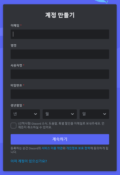 이메일, 별명, 사용자명, 비밀번호, 생년월일을 입력하시면 됩니다. 별명은 다른 사용자들이 볼 수 있는 닉네임같은 거라고 생각하시면 됩니다. 본명을 쓰는 란이 아닙니다. 닉네임 같은 거라고 생각하시면 됩니다. 사용자명도 본명을 사용하지 않으셔도 됩니다. 사용자명은 ID 같은 느낌입니다. 저도 아무거나 입력했습니다.
