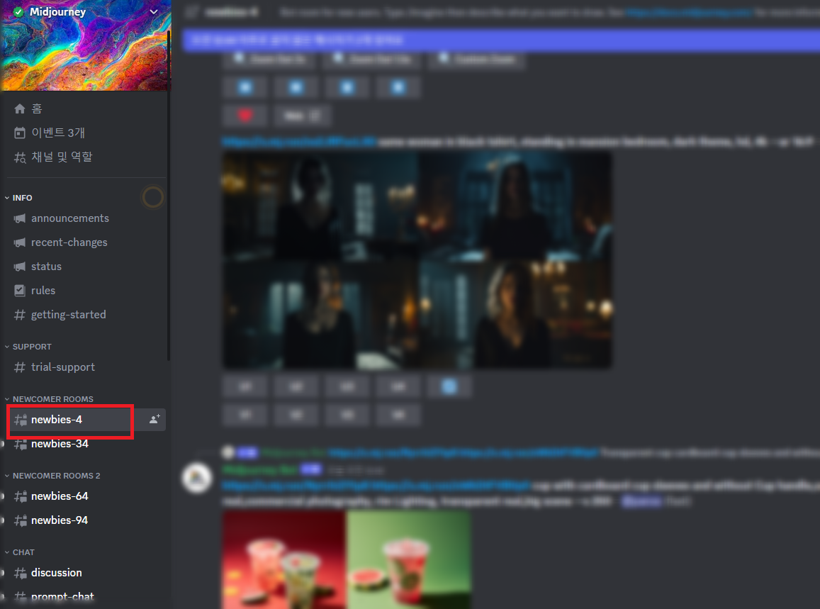 이렇게 들어가시면, 저는 현재 플랜을 구매하지 않았지만 다른 사람들의 그림을 볼 수 있습니다. newbies-4라고 쓰여져 있는 방에 저는 들어가보았는데, 그 외에 newbies-숫자로 구성된 아무 방이나 클릭하시면 그림을 볼 수 있습니다.